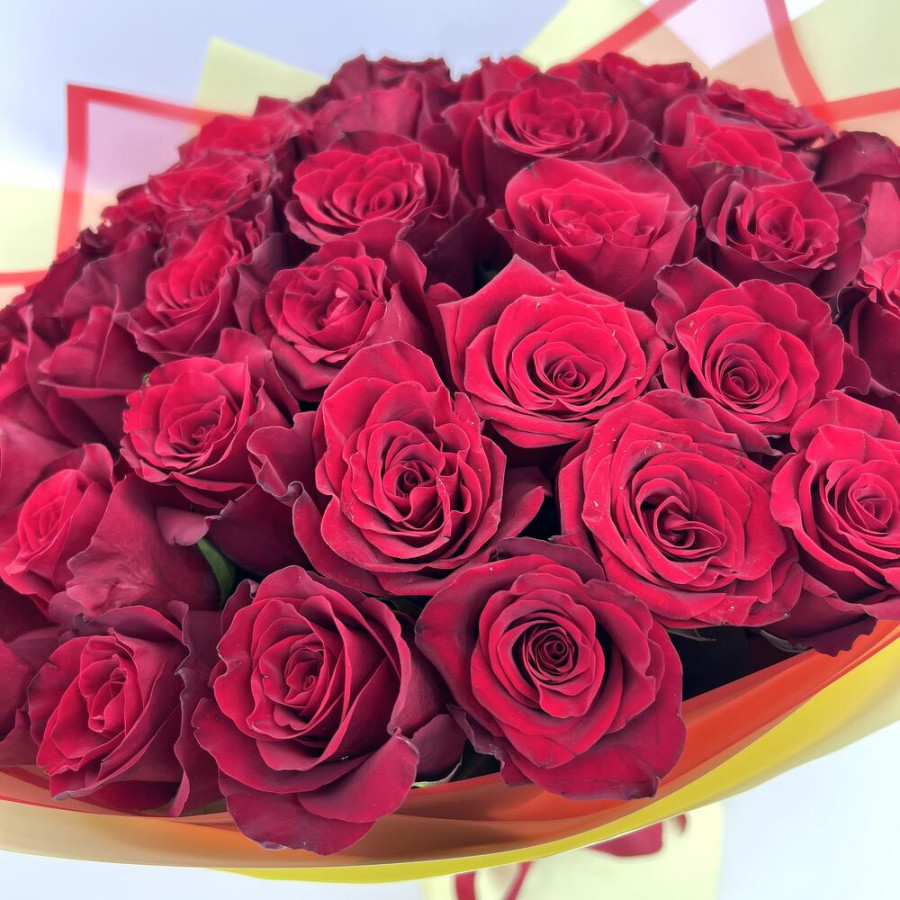 На фото букет из 51 бордовой розы. В составе: роза 51 шт, фоамиран 3 шт, атласная лента 1 шт, . Все цветы свежие и ароматные, букет красиво оформлен и отлично подходит для подарка. Доступна доставка цветов или самовывоз.